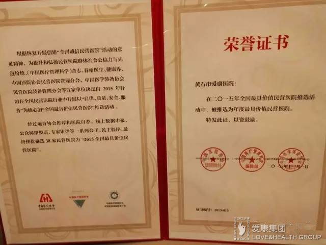 此次“2015全國(guó)最具價(jià)值民營(yíng)醫(yī)院”獎(jiǎng)的獲得,為黃石市愛康醫(yī)院的榮譽(yù)榜填上了及其濃厚的一筆。