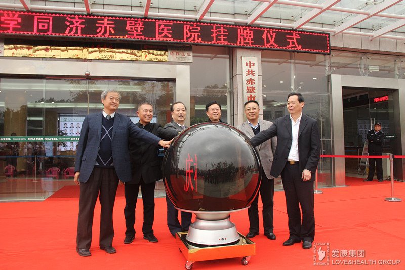 領(lǐng)導(dǎo)致辭完畢后,華中科技大學(xué)黨委常委陳安民宣布掛牌儀式正式開始,掛牌儀式在同濟(jì)赤壁醫(yī)院門診大樓前進(jìn)行,作為啟動(dòng)標(biāo)志物的水晶球格外閃亮,下圖:湖北省衛(wèi)計(jì)委副主任姚云(左四)、華中科技大學(xué)黨委常委陳安民(左三)、同濟(jì)醫(yī)院院長(zhǎng)徐永?。ㄗ笠唬⒈本劭导瘓F(tuán)董事長(zhǎng)王東(左二)、赤壁市委書記江斌(右二)、咸寧市衛(wèi)計(jì)委主任王勇(右一)六位嘉賓共同按下電鈕啟動(dòng)水晶球。