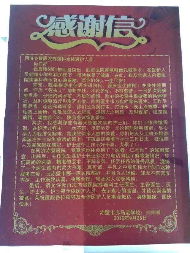 北京愛康集團旗下同濟赤壁醫(yī)院近日收到一份特別的驚喜,日前入住同濟赤壁醫(yī)院疼痛科的劉先生,為了感謝在他住院期間精心照顧他的醫(yī)生和護士特地送來了錦旗與親筆寫的感謝信。