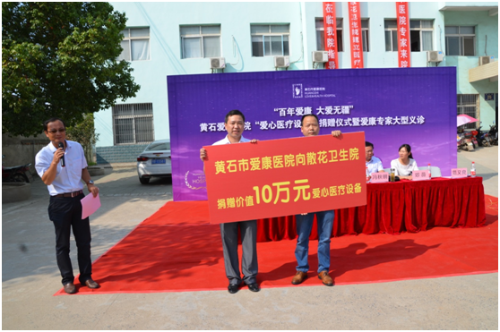 黃石市愛康醫(yī)院院總裁汪成鋼同浠水縣衛(wèi)生局局長馮秋明、散花鎮(zhèn)副鎮(zhèn)長鄧薇女士,散花鎮(zhèn)衛(wèi)生院院長范又良、我院院長史火喜、客服總監(jiān)楊勇等領導參加了捐贈儀式。儀式上,愛康醫(yī)院向散花鎮(zhèn)衛(wèi)生院捐贈價值10萬元的手術室消毒設備和10張病床,并在活動現(xiàn)場完成交接。