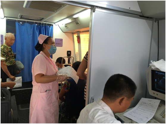 當天上午9時許,體檢車前就排起了長龍。不少居民扶著老人,抱著孩子圍在了體檢車車旁,筆者走進體檢車,見體檢車內潔凈如新,多名醫(yī)護人員正在為排隊上車的居民逐一進行心電圖、B超、聲超、婦科等多項檢查。據(jù)悉,體檢車將不定期地為各個鄉(xiāng)鎮(zhèn)免費送服務,在走村串戶中,醫(yī)護人員為當?shù)鼐用襁M行各項體檢和咨詢服務。