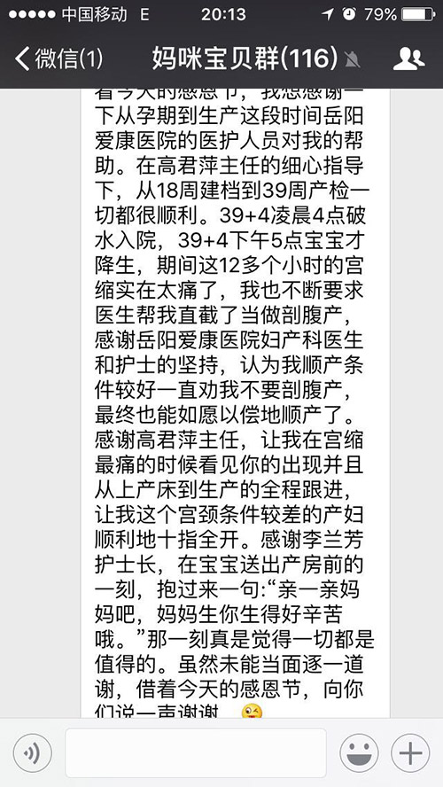 “在患者心里,我應(yīng)該是24小時(shí)在線的。有時(shí)候凌晨兩三點(diǎn),都會(huì)有患者在微信群里問‘護(hù)士長,我寶寶今天一天沒有解大便怎么辦?’‘護(hù)士長,我寶寶吐奶了怎么辦?’問題簡單,處理方法也不復(fù)雜,但對(duì)于患者和家屬確是棘手和擔(dān)憂的大問題。所以每天只要有一點(diǎn)空閑,我都會(huì)趕緊看看手機(jī),抓緊時(shí)間回答患者在微信群里的疑問。對(duì)于那些比較特殊的疑問, 不便群聊里解決的,都會(huì)單獨(dú)加微信私信回復(fù),保護(hù)患者隱私、照顧她們的情緒。”