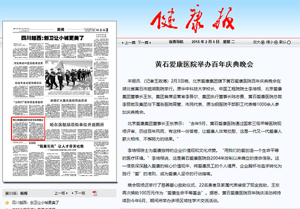 北京愛(ài)康集團(tuán)董事長(zhǎng)王東表示:“去年9月,黃石愛(ài)康醫(yī)院通過(guò)國(guó)家三級(jí)甲等醫(yī)院現(xiàn)場(chǎng)評(píng)審,歷經(jīng)百年風(fēng)雨,有這樣一份答卷,讓愛(ài)康人非常欣慰,這是一代又一代愛(ài)康人薪火相傳、不懈努力的結(jié)果。”