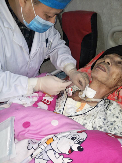作為石爹爹的管床醫(yī)生,張均邁主任這次特意放下手中的事,前往陽新為石爹爹更換氣管套管和拔除中心靜脈置管,并查看他近期的情況。
