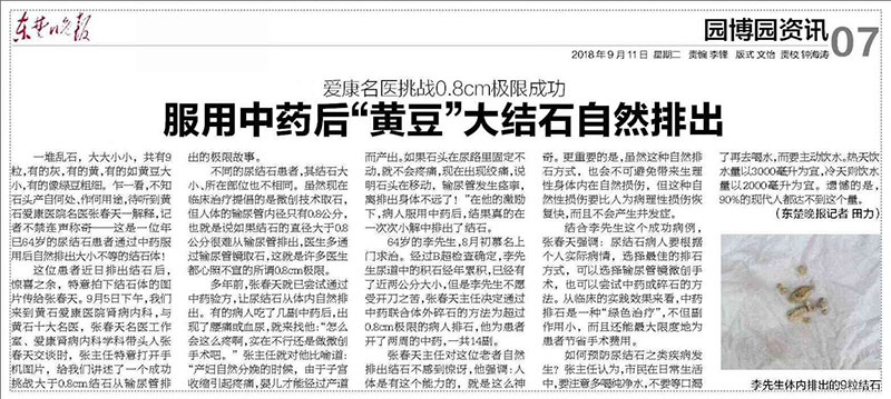 多年前,張春天就已嘗試通過中藥驗方,讓尿結(jié)石從體內(nèi)自然排出。有的病人吃了幾副中藥后,出現(xiàn)了腰痛或血尿,就來找他:“怎么會這么疼啊,實在不行還是做微創(chuàng)手術(shù)吧。”張主任就對他比喻道:“產(chǎn)婦自然分娩的時候,由于子宮收縮引起疼痛,嬰兒才能經(jīng)過產(chǎn)道而產(chǎn)出。如果石頭在尿路里固定不動,就不會疼痛,現(xiàn)在出現(xiàn)絞痛,說明石頭在移動,輸尿管發(fā)生痙攣,離排出身體不遠(yuǎn)了!”在他的激勵下,病人服用中藥后,結(jié)果真的在一次次小解中排出了結(jié)石。