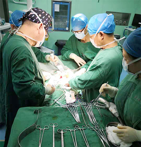 術中證實患者十二指腸破裂,危在旦夕!立即行腹腔鏡探查中轉開腹十二指腸破裂修補術、胰腺挫裂修補術、胃竇及系膜挫裂修補術、空腸營養(yǎng)管置入術。此手術復雜、技術難度大、手術時間長,柯醫(yī)生強忍著不適堅持配合何主任順利完成手術!患者安全返回病房,柯醫(yī)生也累癱在麻醉科的地上!目前,患者術后生命體征穩(wěn)定,已從ICU轉回普外科病房。