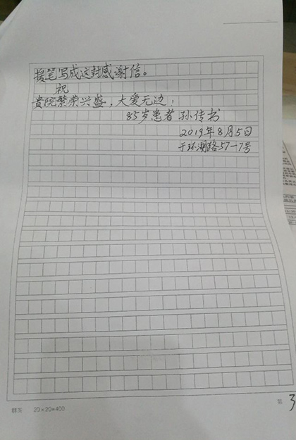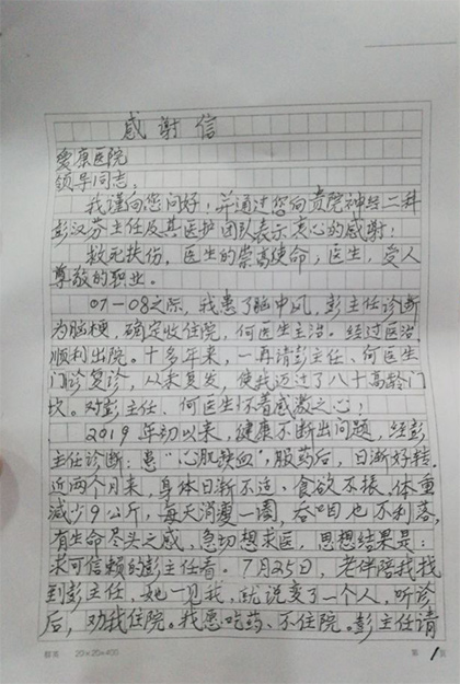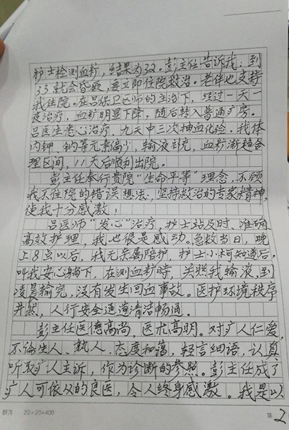 “感謝彭漢芬主任的堅持救治,才使我得以恢復(fù),令人終身感激。”“急救日當晚八點后,我無親屬陪伴,護士小柯知道后,叫我安心躺下,關(guān)照我輸液,到凌晨輸完,沒有發(fā)生回血事故。”