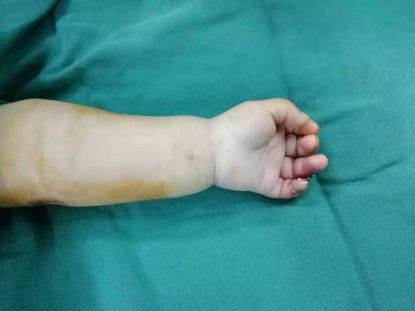 拆開(kāi)紗布,我也不由得倒吸一口涼氣,左小指掌側(cè)末節(jié)能見(jiàn)大約1.5CM*1.0CM范圍軟組織缺損,末節(jié)指骨外露,指甲部分缺失。揪心,才一歲的孩子,怎么忍受得了這個(gè)疼痛!也是孩子父親的我,心里隨著孩子的哭聲一陣陣疼痛……