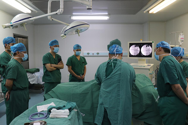 在仔細研究和評估了患者的病情以及各項身體狀況,并充分考慮其心理顧慮后,專家們一致同意采取局麻內(nèi)鏡下腰L2-3突出髓核摘除、神經(jīng)根松解和硬膜囊減壓的手術(shù)方案。在手術(shù)方案達成一致后,專家團隊一同進入手術(shù)室進行現(xiàn)場技術(shù)交流。這樣的手術(shù)對胡利民主任來說已經(jīng)駕輕就熟,他最多的一天連續(xù)做了四臺椎間孔鏡微創(chuàng)手術(shù)。