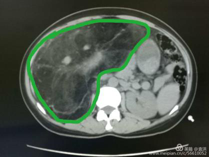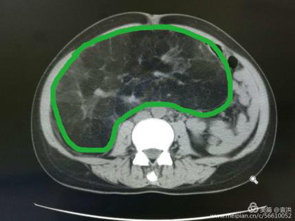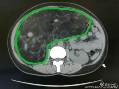 這一檢查讓婦科醫(yī)生也大吃一驚!醫(yī)生檢查時(shí)觸及腹部一硬質(zhì)包塊,無(wú)明顯邊界,上至劍突下,下至盆腔,兩側(cè)至腋中線,無(wú)壓痛,固定,說(shuō)明這包塊占據(jù)了患者整個(gè)腹腔,考慮來(lái)源于其它臟器,立即行全腹CT檢查??苫颊哂忻荛]空間綜合癥,一開(kāi)始拒絕CT檢查,醫(yī)生反復(fù)給患者做思想工作,并強(qiáng)調(diào)此項(xiàng)檢查的重要性,患者足足猶豫了兩天,才終于在醫(yī)護(hù)人員及家屬的鼓勵(lì)下順利完成了檢查。腹部CT提示,高度懷疑右腎有一顆脂肪肉瘤。