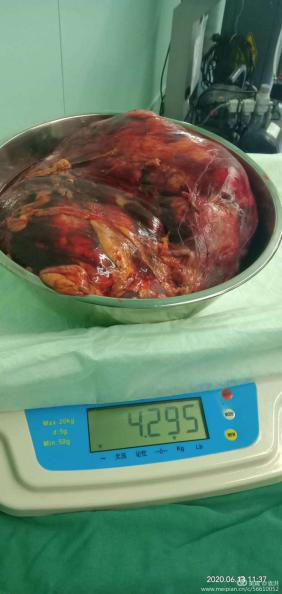 術(shù)中,可見(jiàn)患者腫瘤包繞右腎,占據(jù)大半個(gè)腹腔,與腹部大血管粘連。經(jīng)過(guò)多學(xué)科聯(lián)合診療(MDT),最終完整切除腫瘤。足足有八斤多重,術(shù)中出血少,無(wú)需輸血。目前患者無(wú)陰道流血不適,待病情穩(wěn)定后,再擇期行子宮肌瘤切除術(shù)。患者丈夫看到這么大的腫瘤,著實(shí)吃了一驚,同時(shí)也感謝醫(yī)生們的妙手仁心。