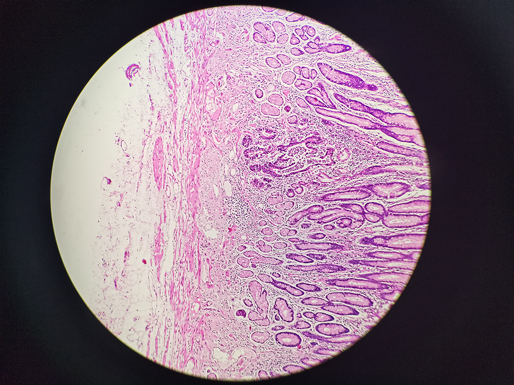 2020年8月20日下午,病理科收到手術室送來的標本,其中有一例胃部分切除的標本,肉眼沒有看到腫塊,只有胃粘膜有一處用手術縫線捆扎。病理醫(yī)生仔細觀察標本,剪開縫線捆扎處,并未發(fā)現(xiàn)異常,又查閱原病理報告并復查切片,而腫瘤是確實存在的……