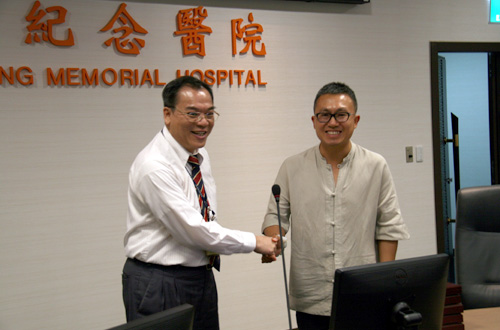 北京愛康醫(yī)療董事長王東先生(右)和長庚醫(yī)院戴總(左)親切交流