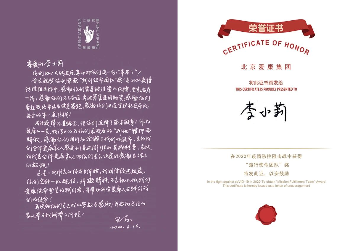 這時(shí)我們方才知道,為了向愛康抗疫英雄們致敬,王東博士親自手書感謝信,并請(qǐng)國內(nèi)著名藝術(shù)家設(shè)計(jì)制作了金、銀質(zhì)勛章。勛章正面是愛康LOGO佛手慧眼圖,代表承諾,承諾愛康人像觀音菩薩一樣,以慈悲之心、普度眾生之心、利他之心,平等地對(duì)待每一位患者,勛章的背面印有“大醫(yī)精誠,生命平等”八個(gè)字,還有2020抗疫前線紀(jì)念的字樣,既是企業(yè)精神的表達(dá),同時(shí)也是“逆行者”剛強(qiáng)不屈的時(shí)代英雄特征的表達(dá)。綬帶上不僅印有愛康“用我們的愛創(chuàng)造一個(gè)生命平等的醫(yī)療環(huán)境”的使命,還印上了1500名愛康抗疫醫(yī)護(hù)人員的名字。