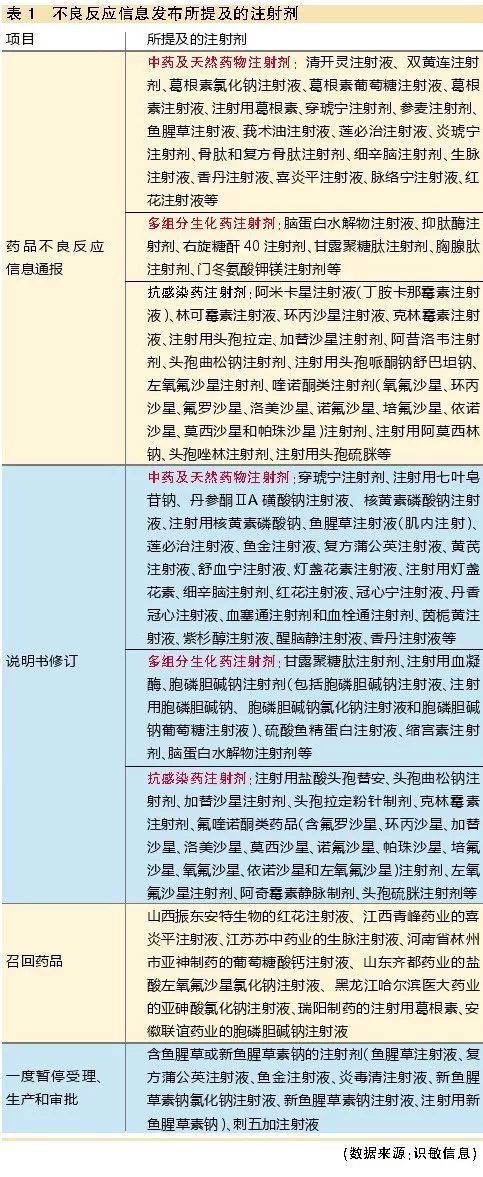 整理數(shù)據(jù)后發(fā)現(xiàn),大多數(shù)上了《藥品不良反應(yīng)信息通報(bào)》的注射劑都會(huì)要求修訂說(shuō)明書,說(shuō)明書主要完善的內(nèi)容為警示語(yǔ)、不良反應(yīng)、禁忌等相關(guān)信息。進(jìn)入《藥品不良反應(yīng)信息通報(bào)》的注射劑主要是中藥注射劑、多組分生化藥注射劑和抗感染藥注射劑。這三類也是歷年《國(guó)家藥品不良反應(yīng)監(jiān)測(cè)年度報(bào)告》中常常被點(diǎn)名的品類。