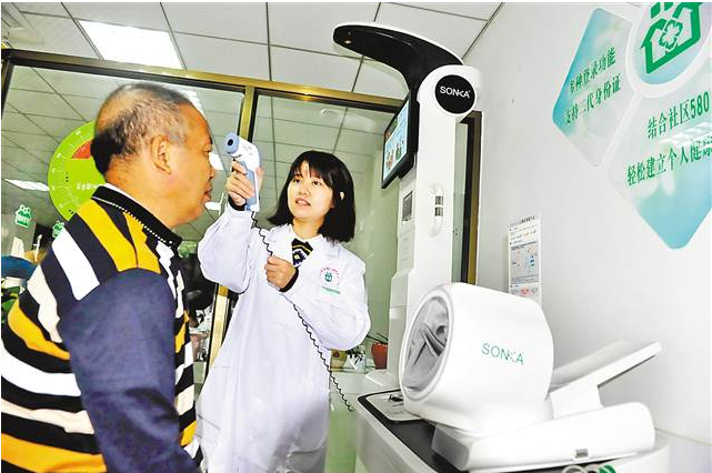 沙坪壩區(qū)天星橋社區(qū)衛(wèi)生服務(wù)中心,居民正在用“健康一體機(jī)”免費(fèi)體檢。